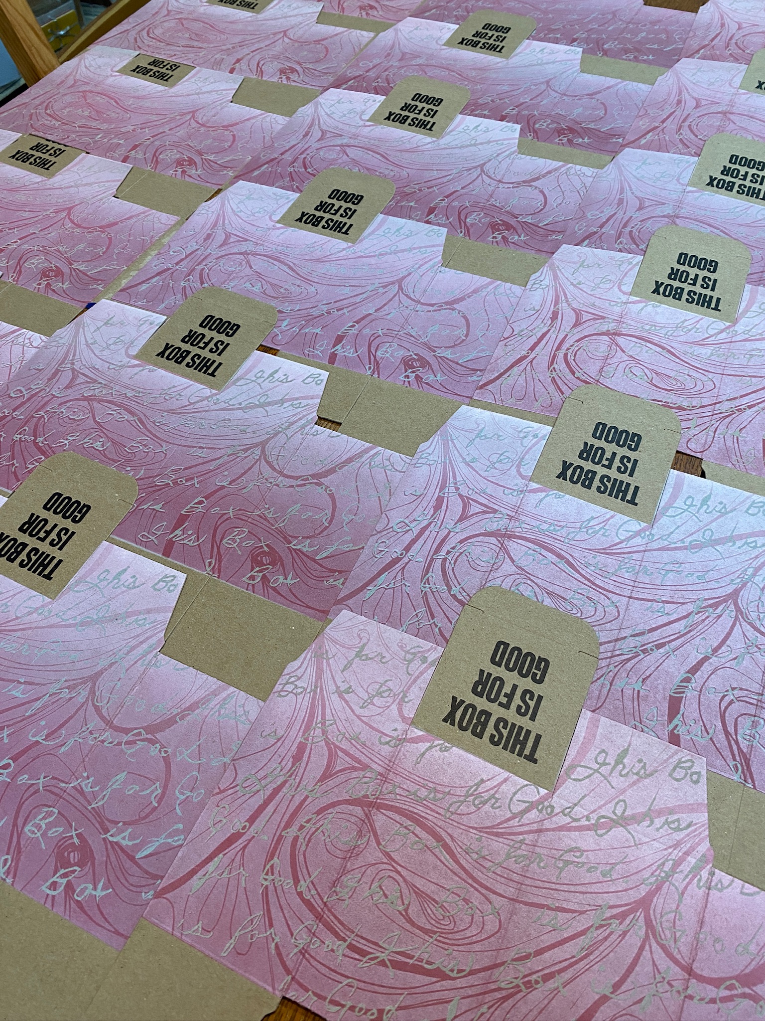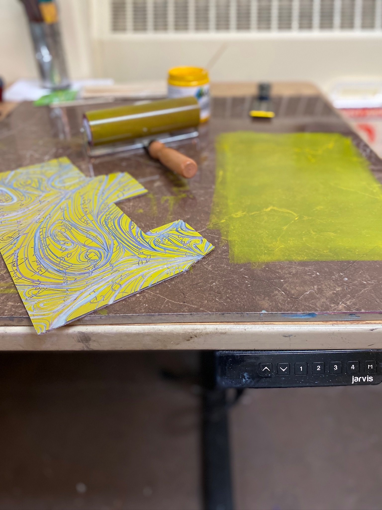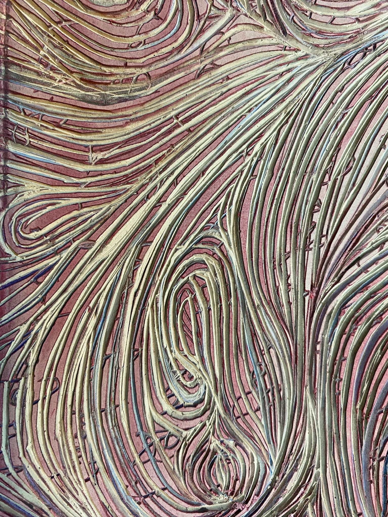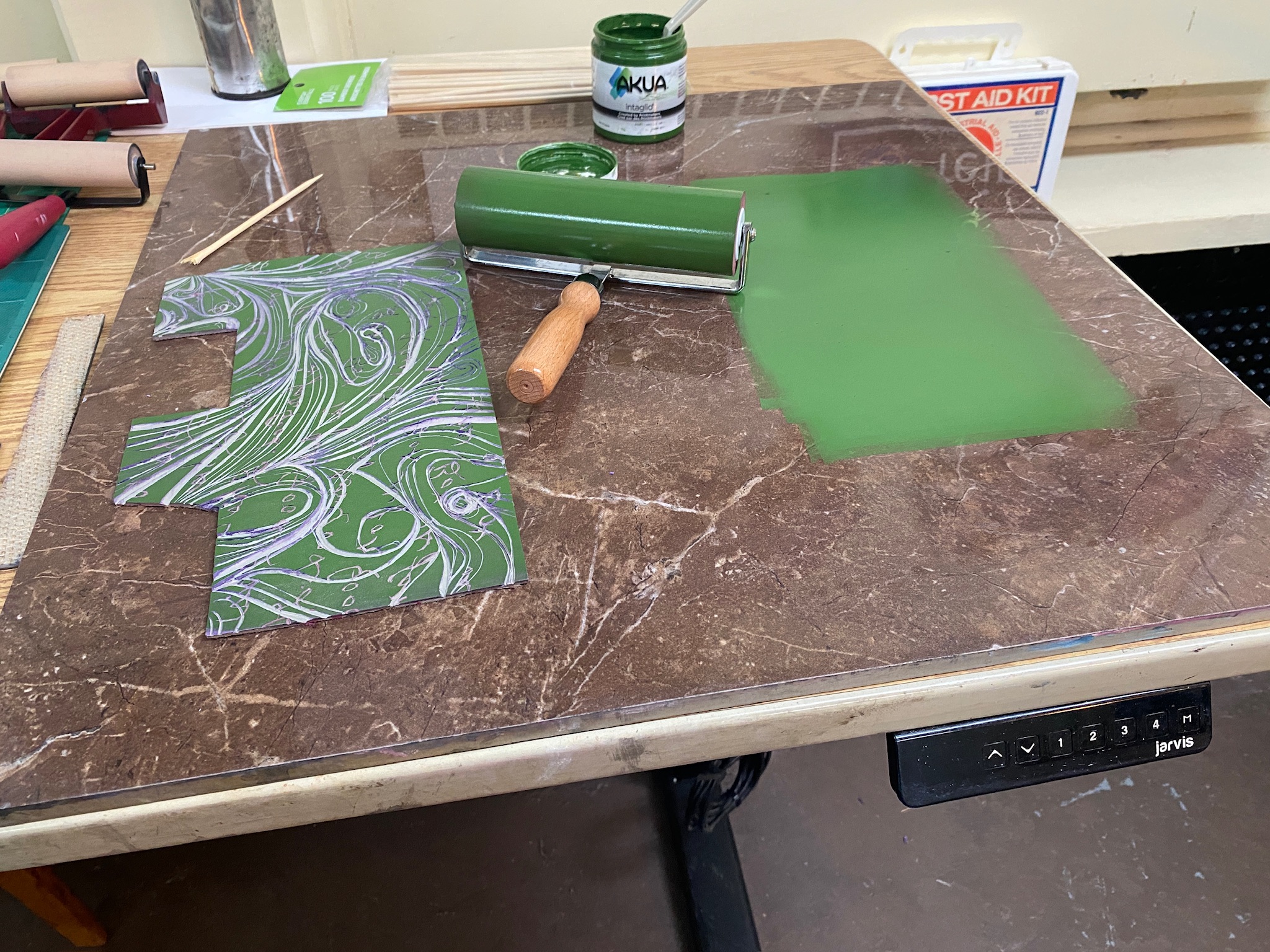 The design of the March 2025 box saw Lisa working to recreate the look of Florentine marbled paper using the reduction process, carving, printing, carving more, printing, and so on, over multiple layers.
