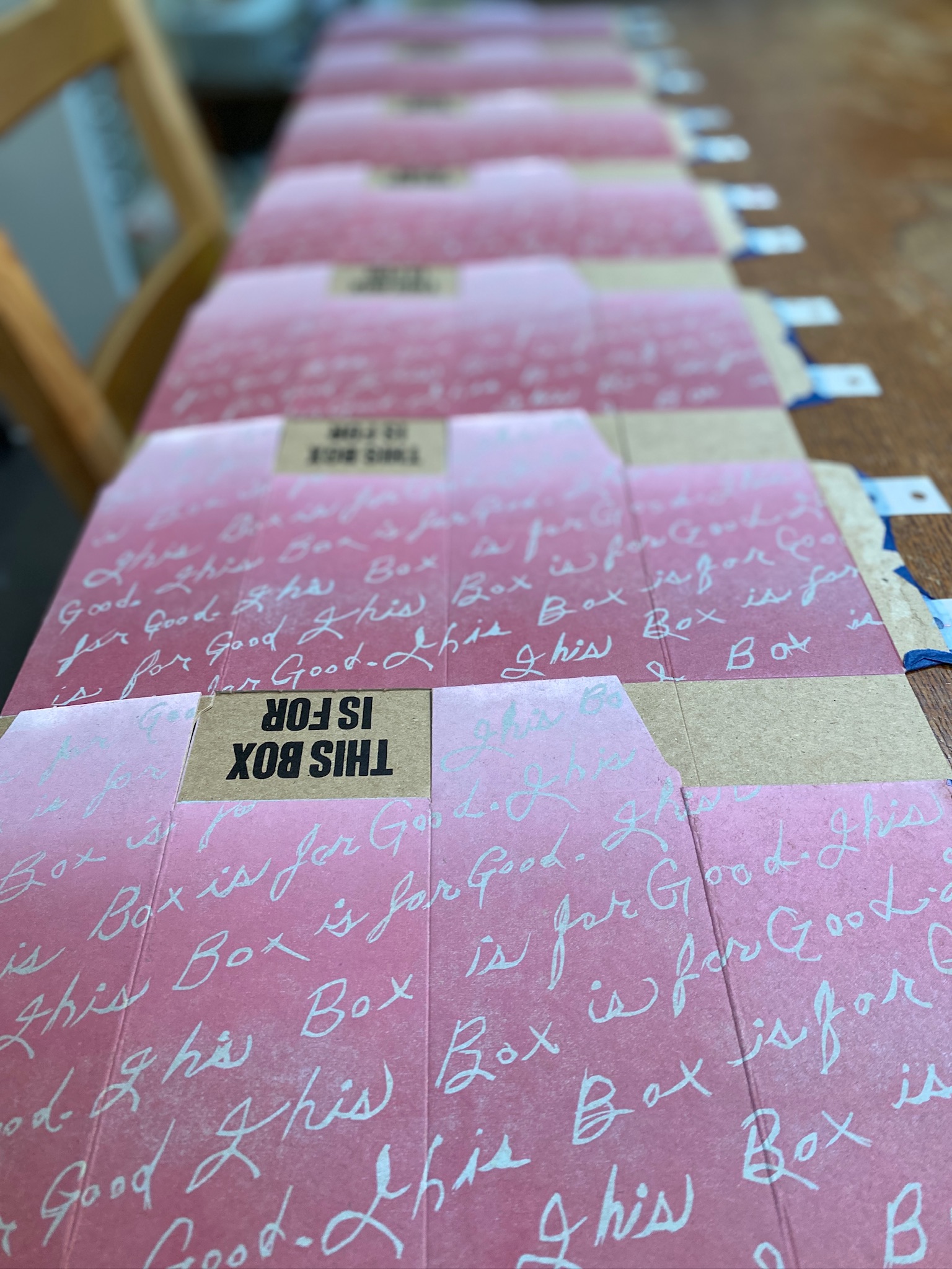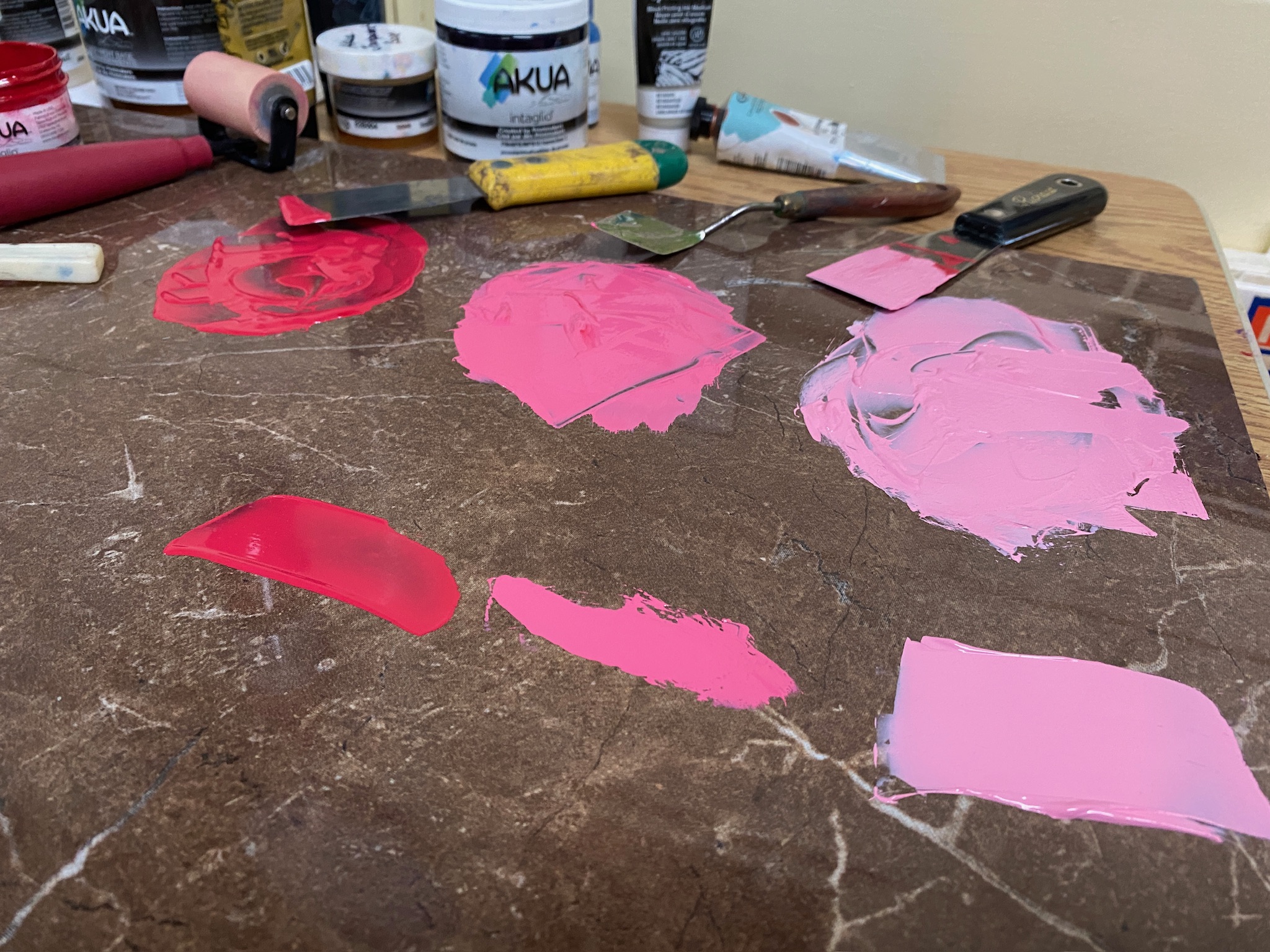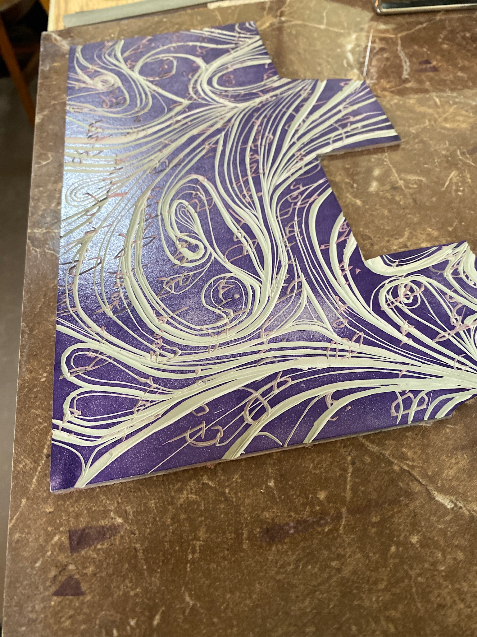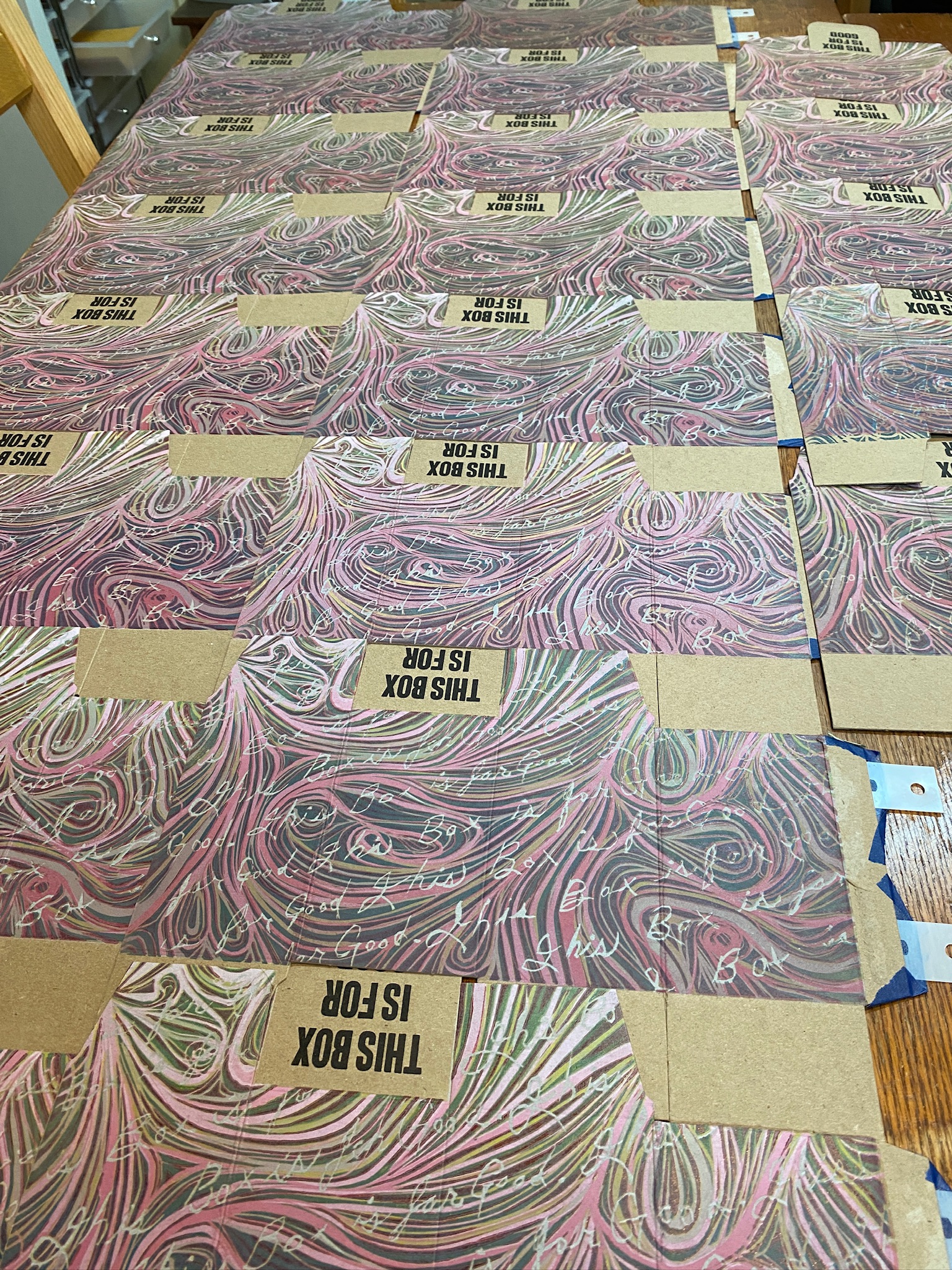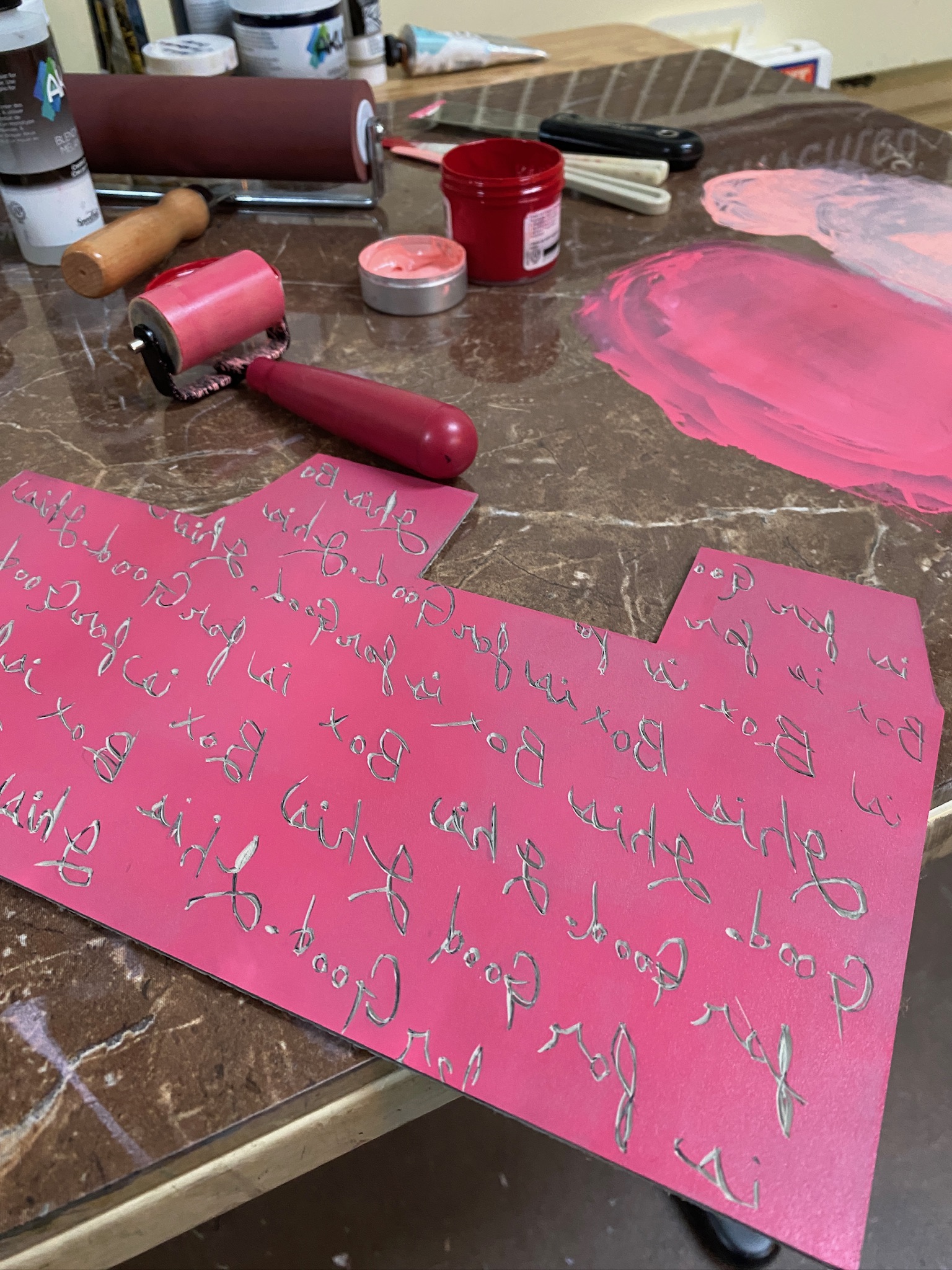 The design of the March 2025 box saw Lisa working to recreate the look of Florentine marbled paper using the reduction process, carving, printing, carving more, printing, and so on, over multiple layers.