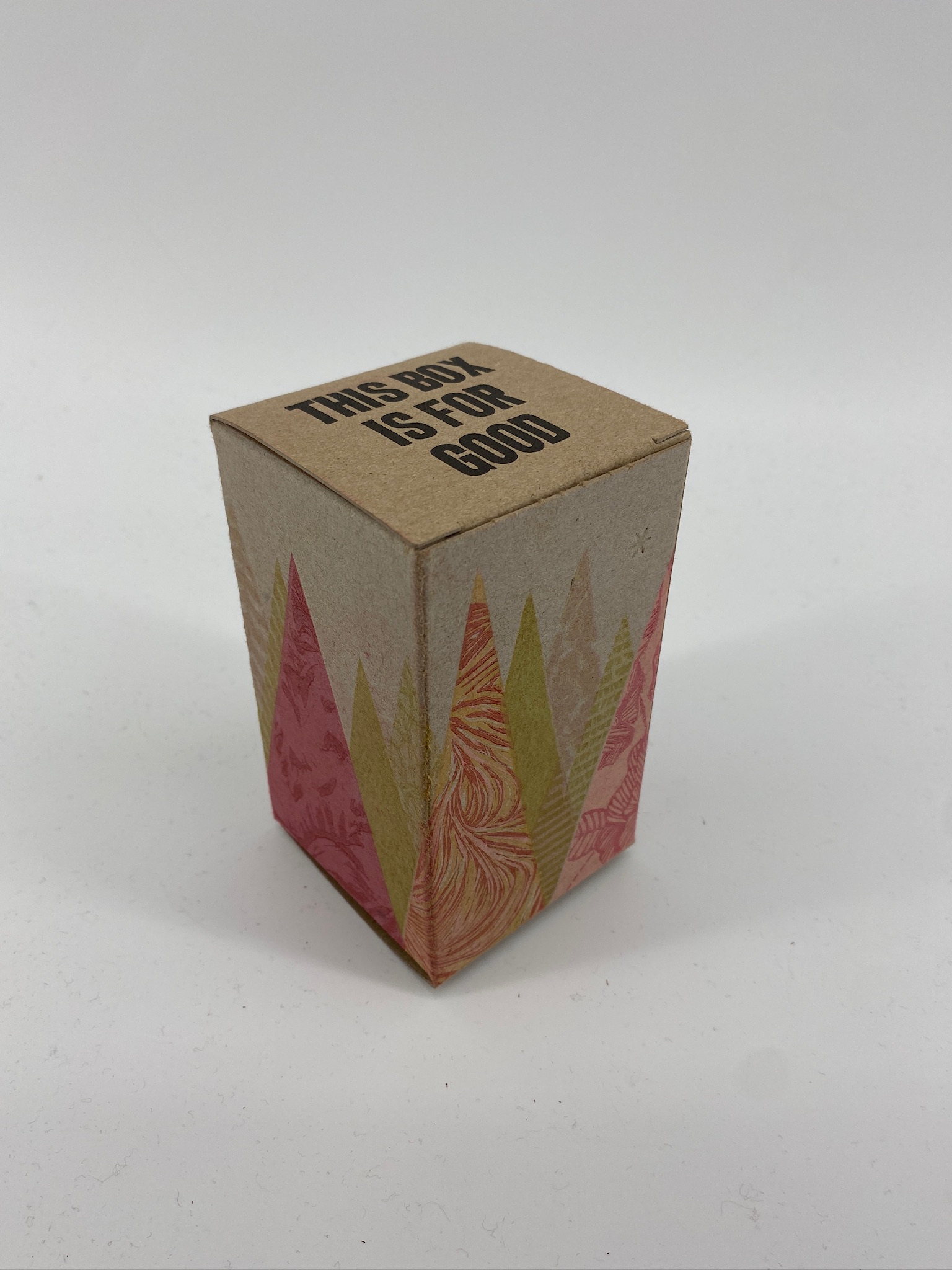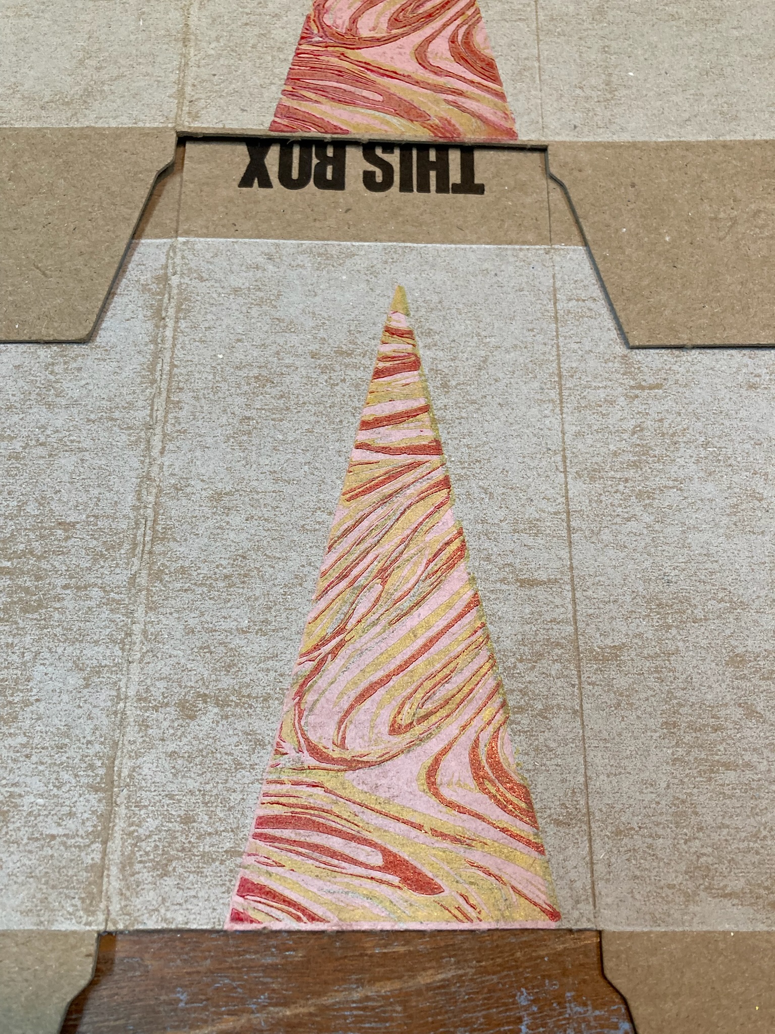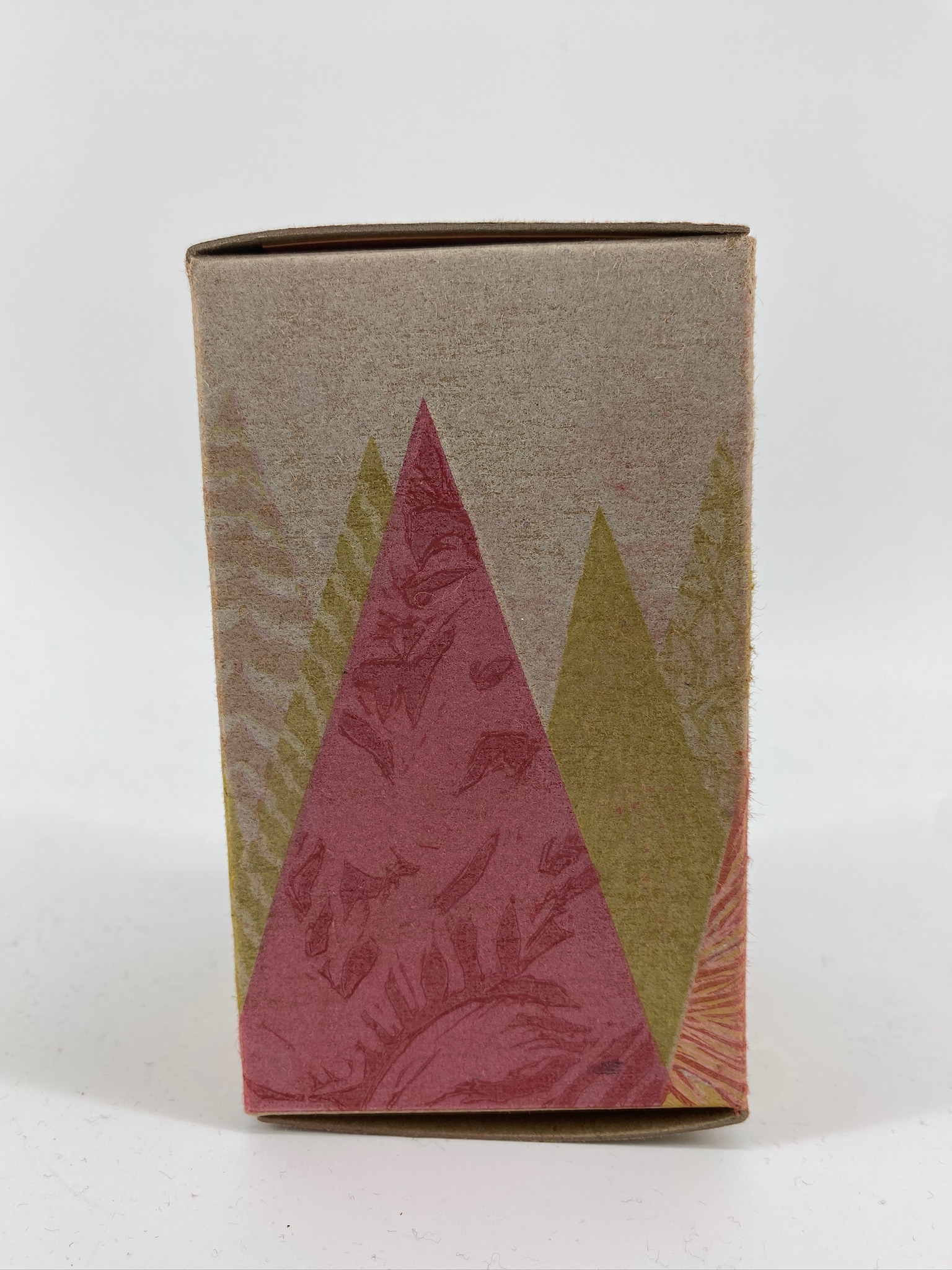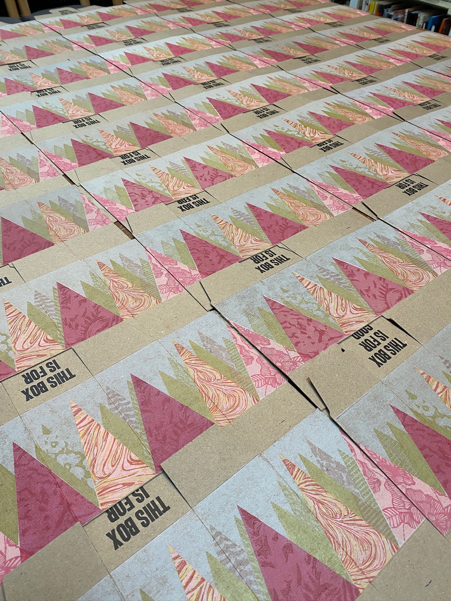 We printed a solid cream-coloured underlayer on the boxes, and then printed trees in pink: