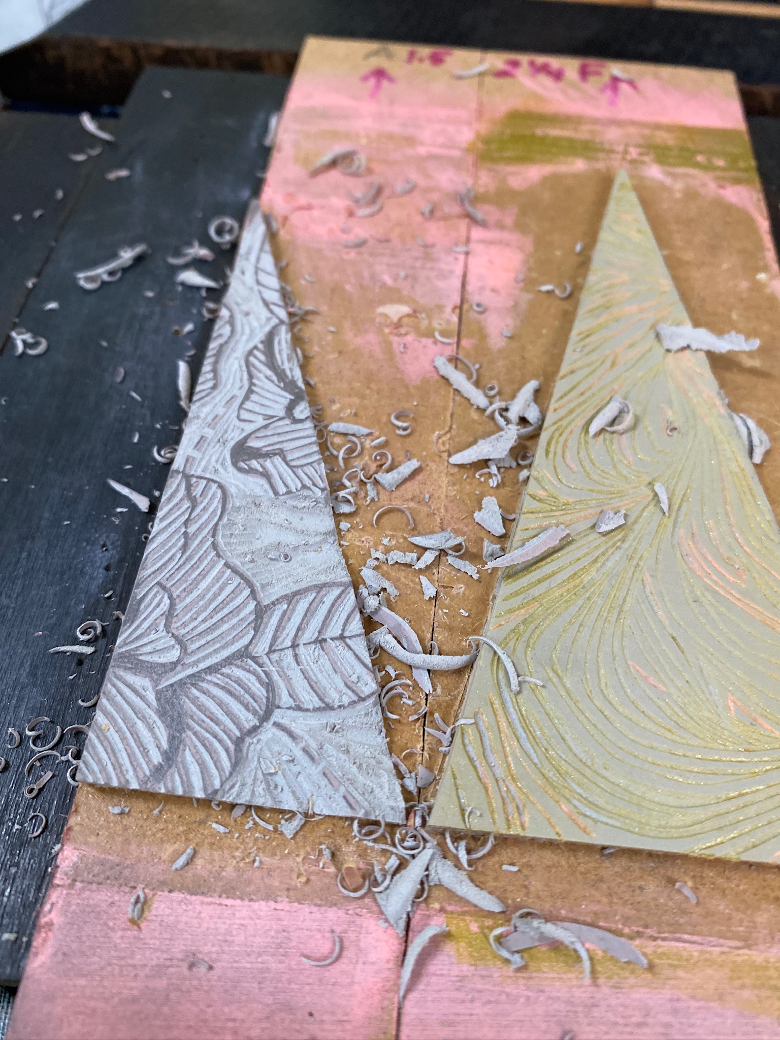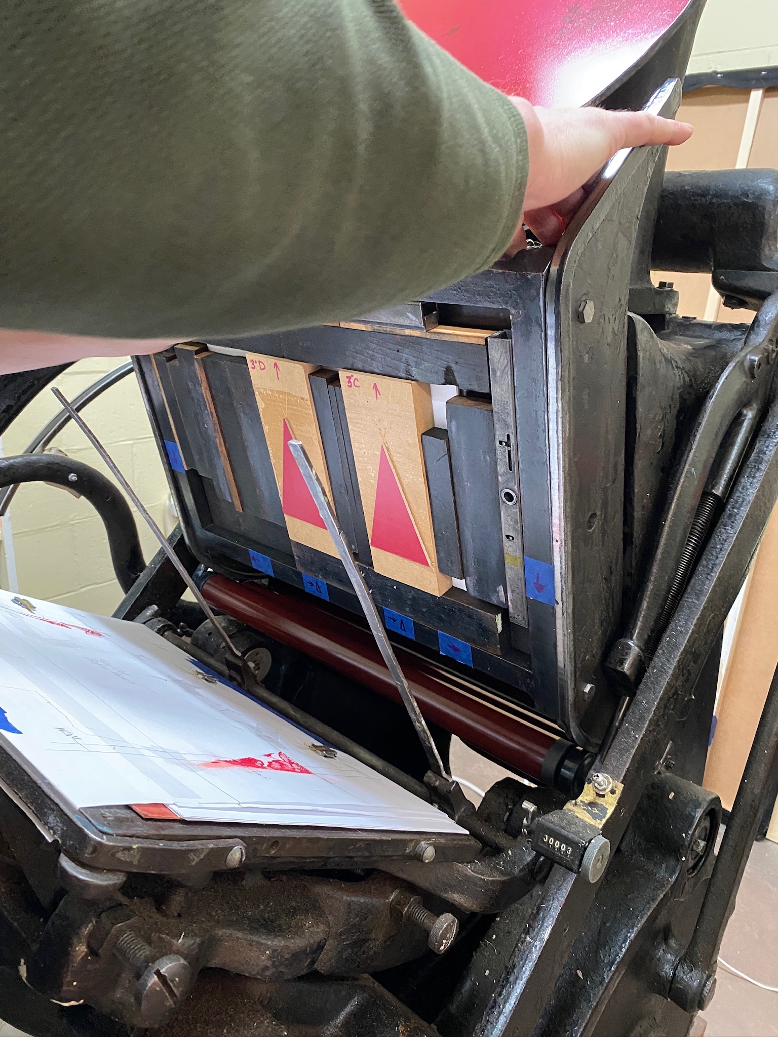 Lisa then carved designs into these “tree triangles,” and we set them in the chase for the letterpress: