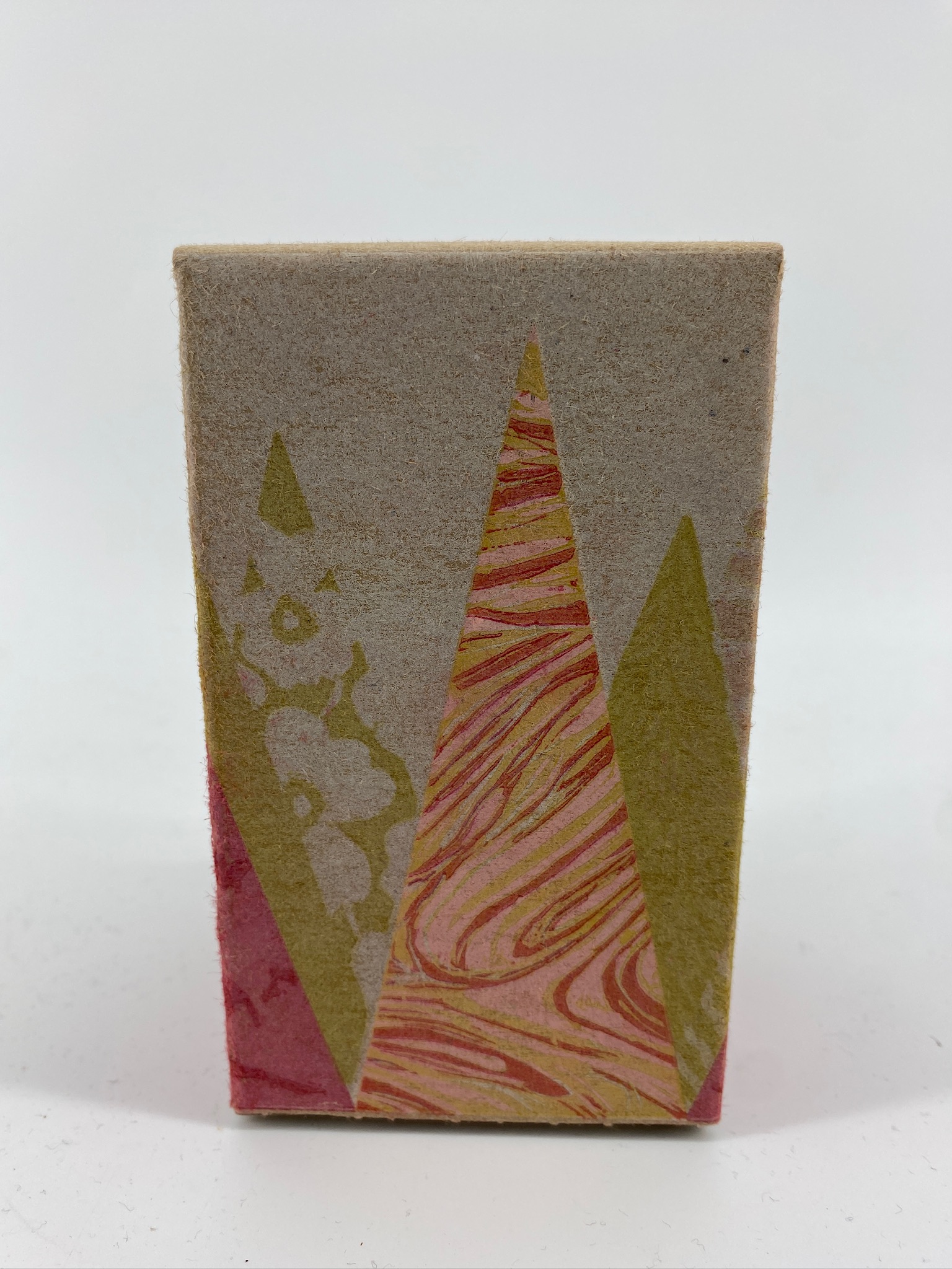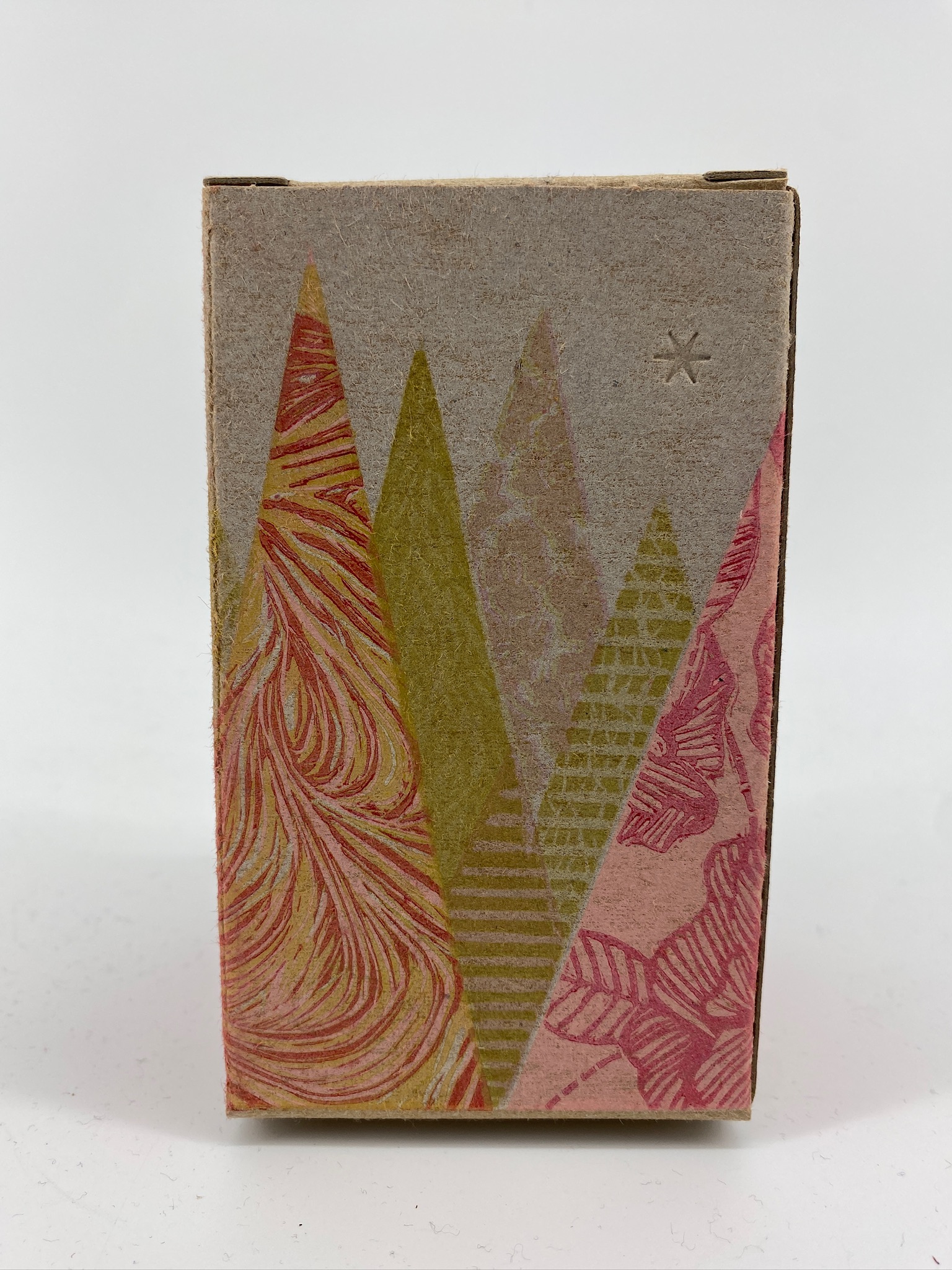 Lisa’s vision from the beginning involved trees, represented as simple triangles, each triangle rendered in a different colour and pattern. She started off sketching-in-ink with a prototype made from roughly carved stamps: